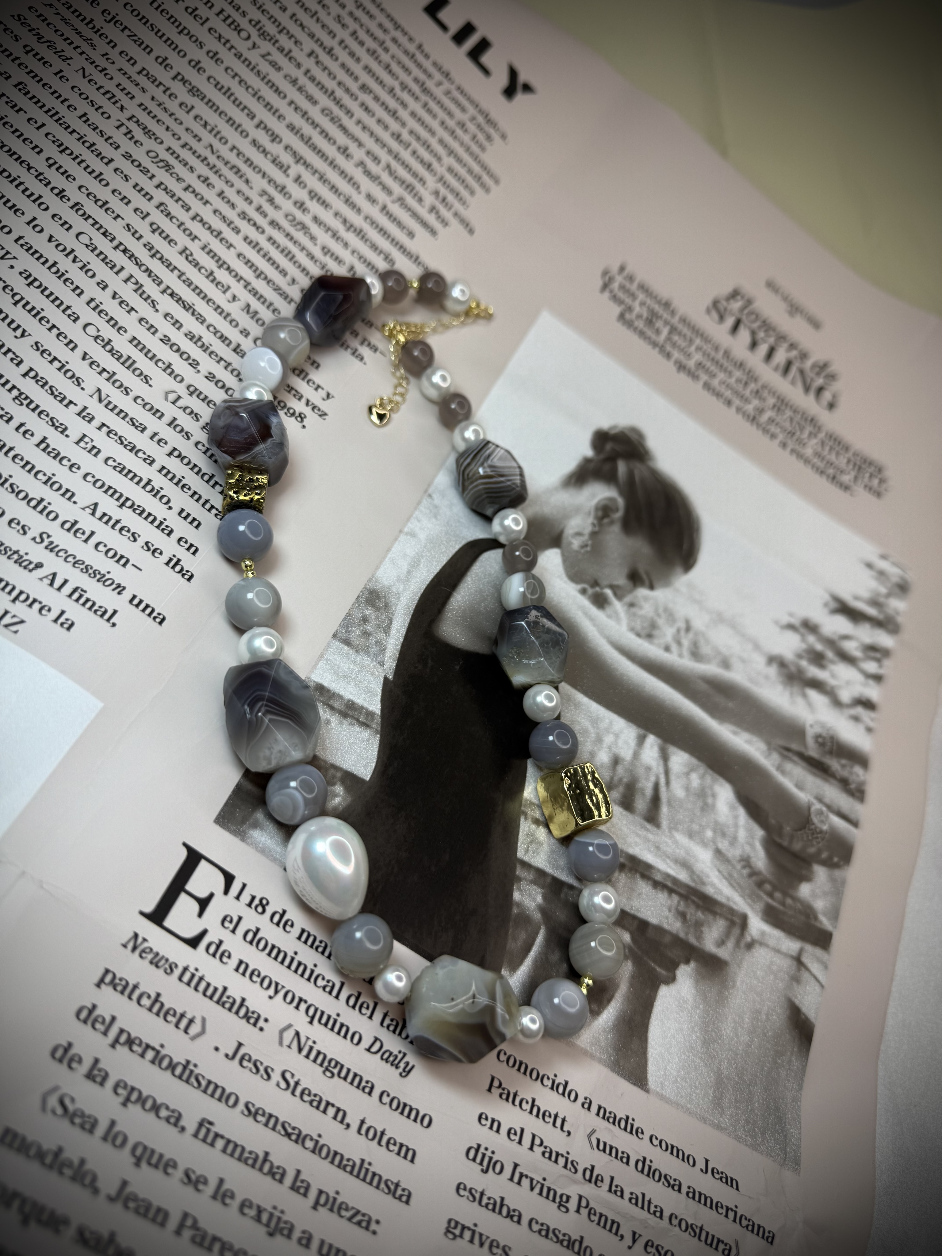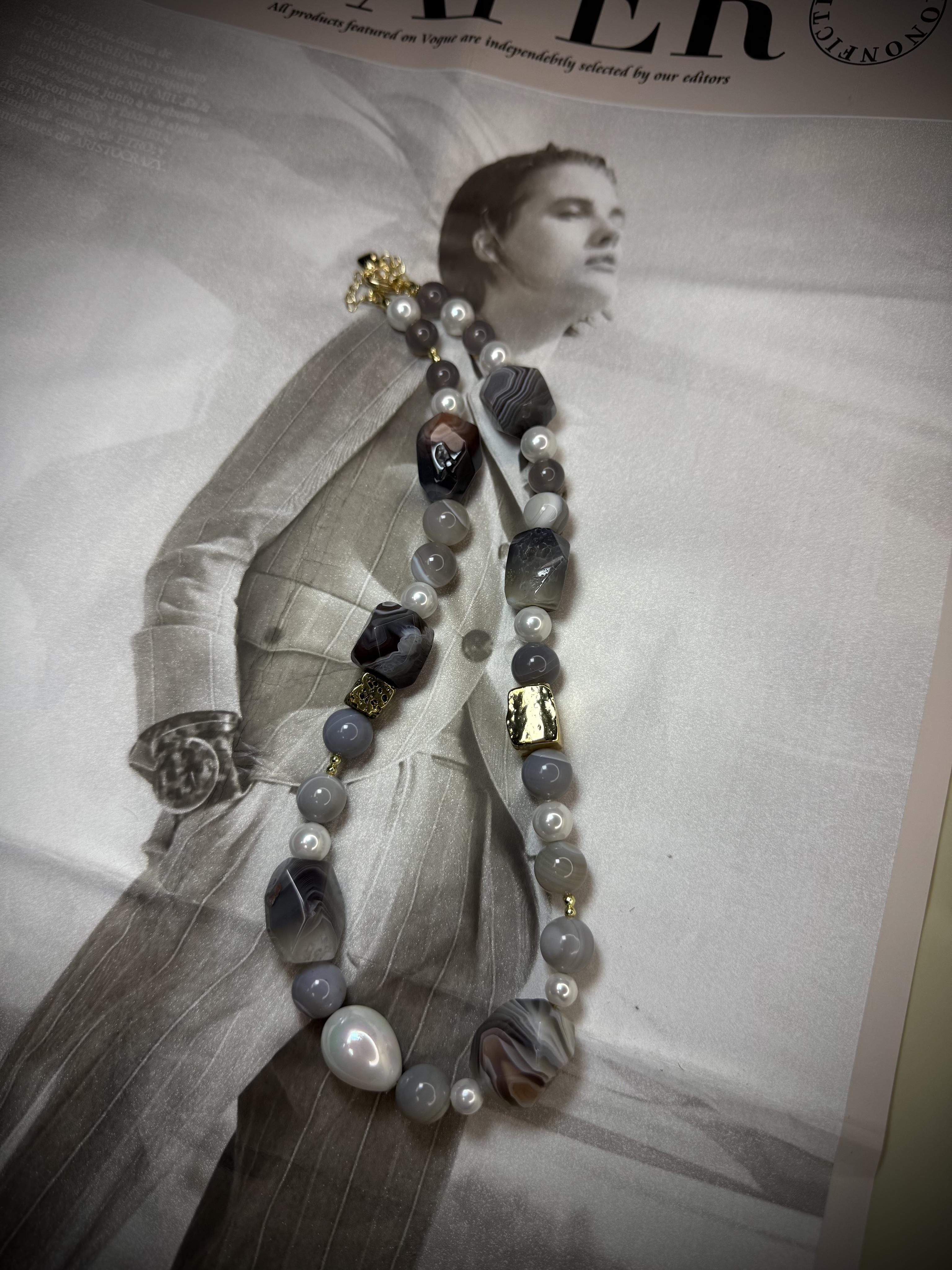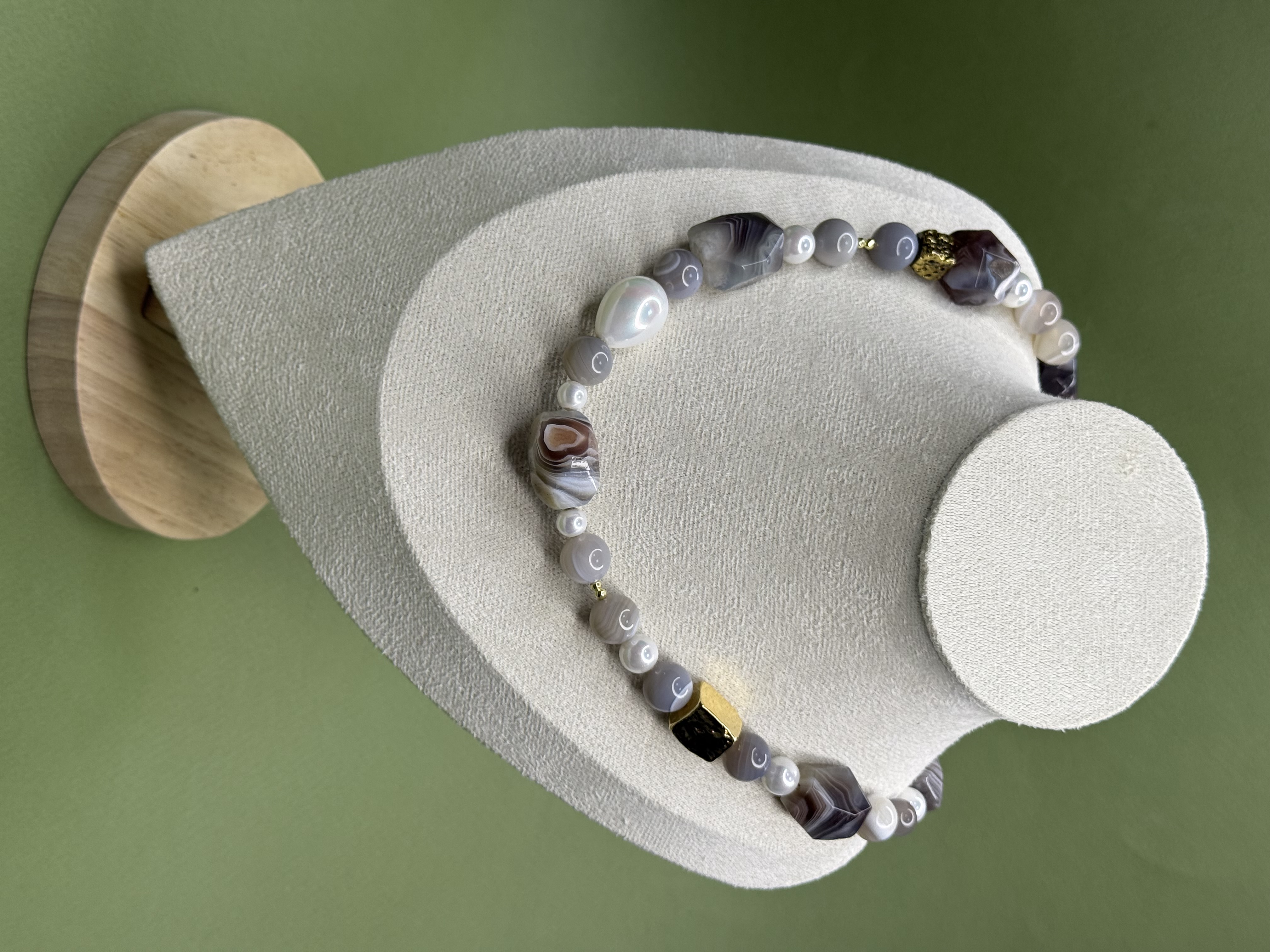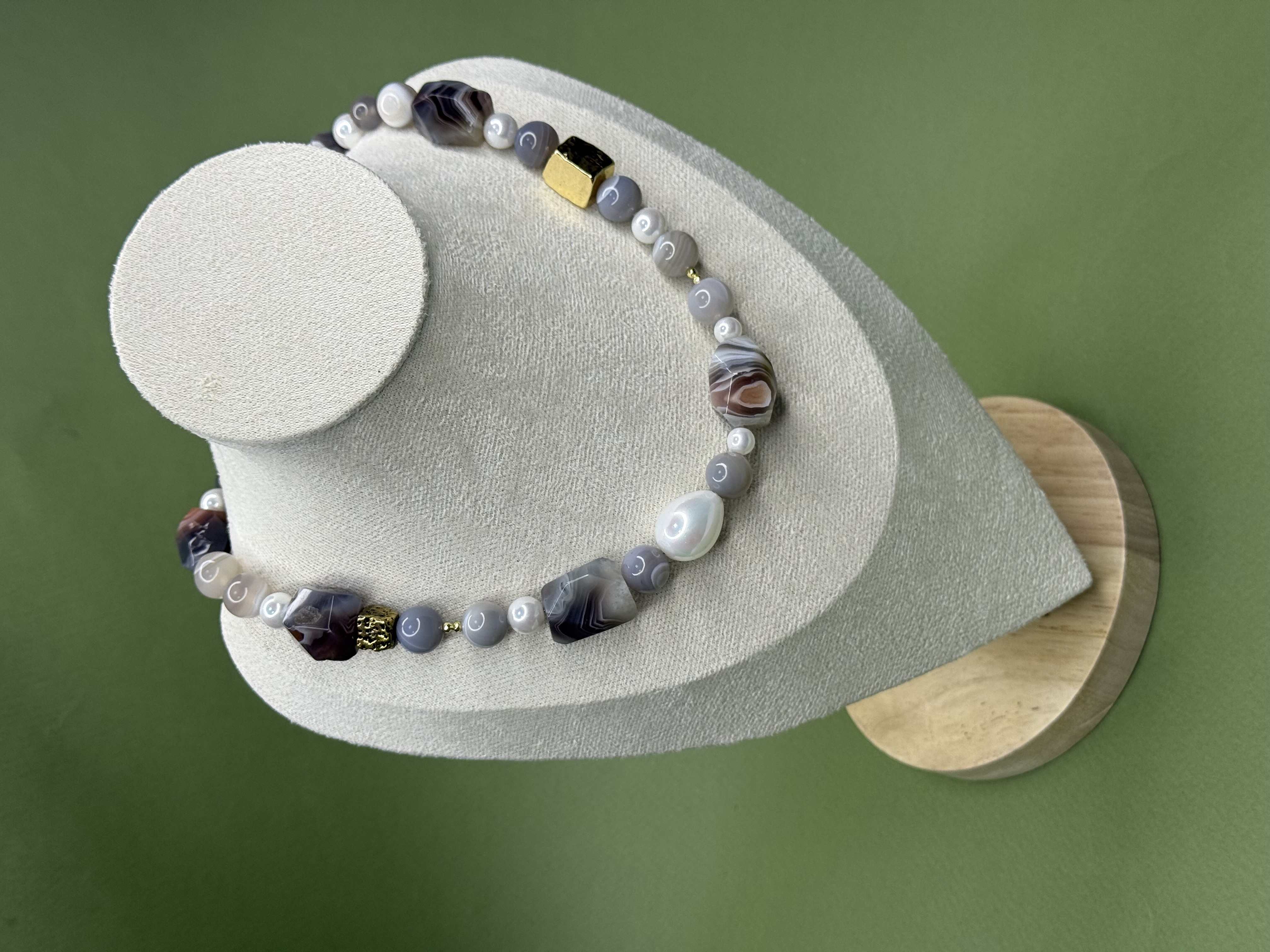 Материалы: агат Ботсвана, жемчуг Майорка, вулканическая лава, ювелирный сплав с позолотой.
