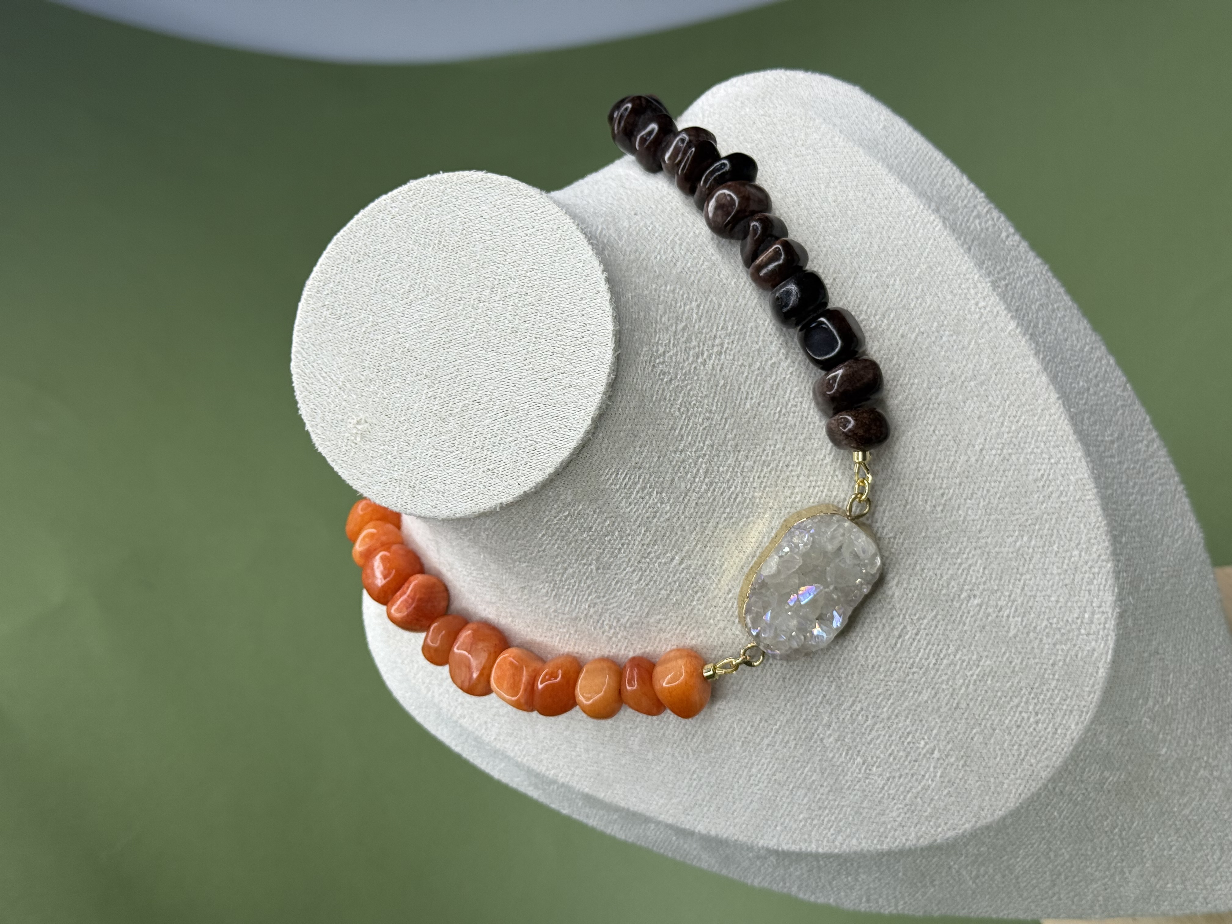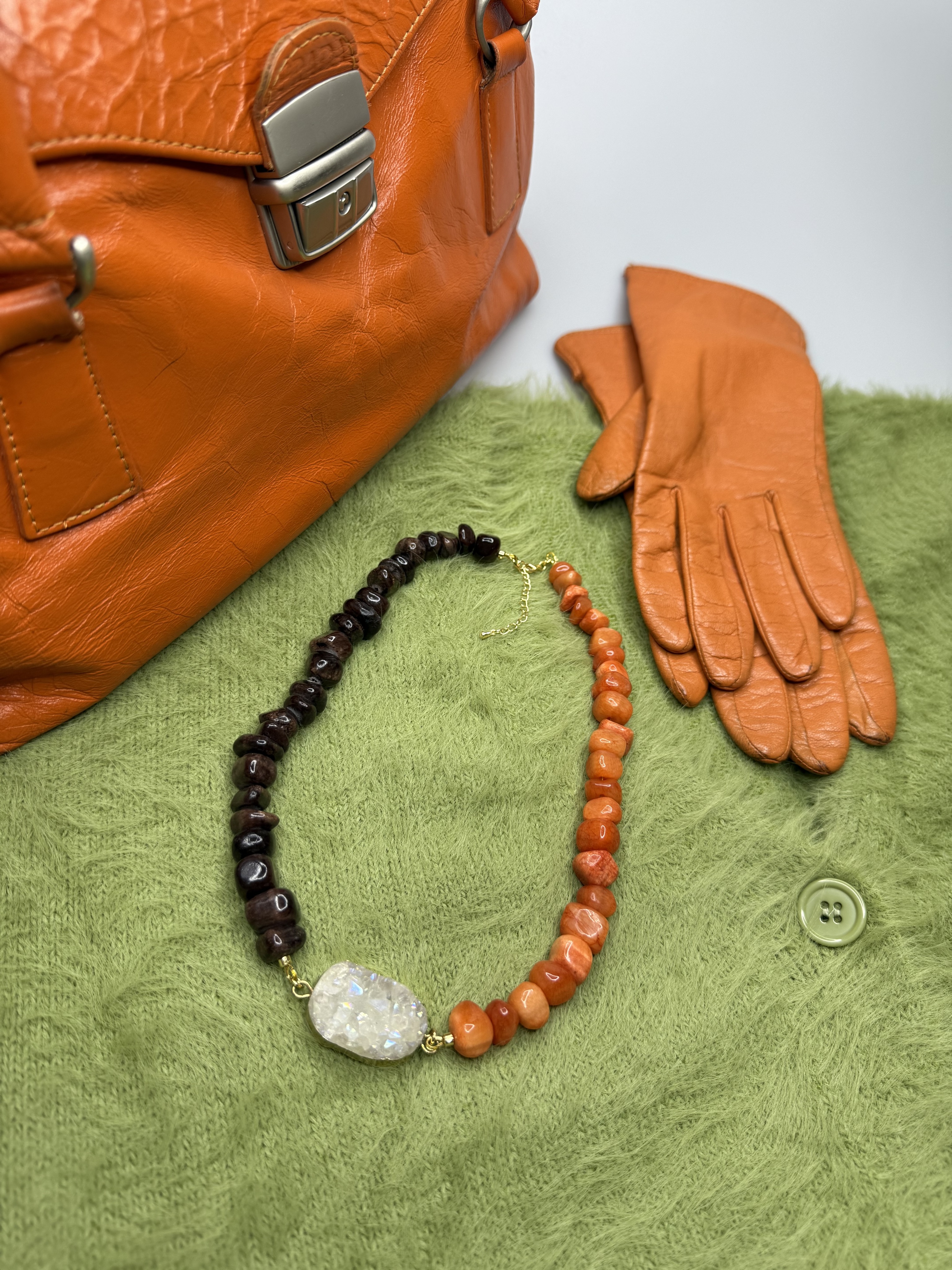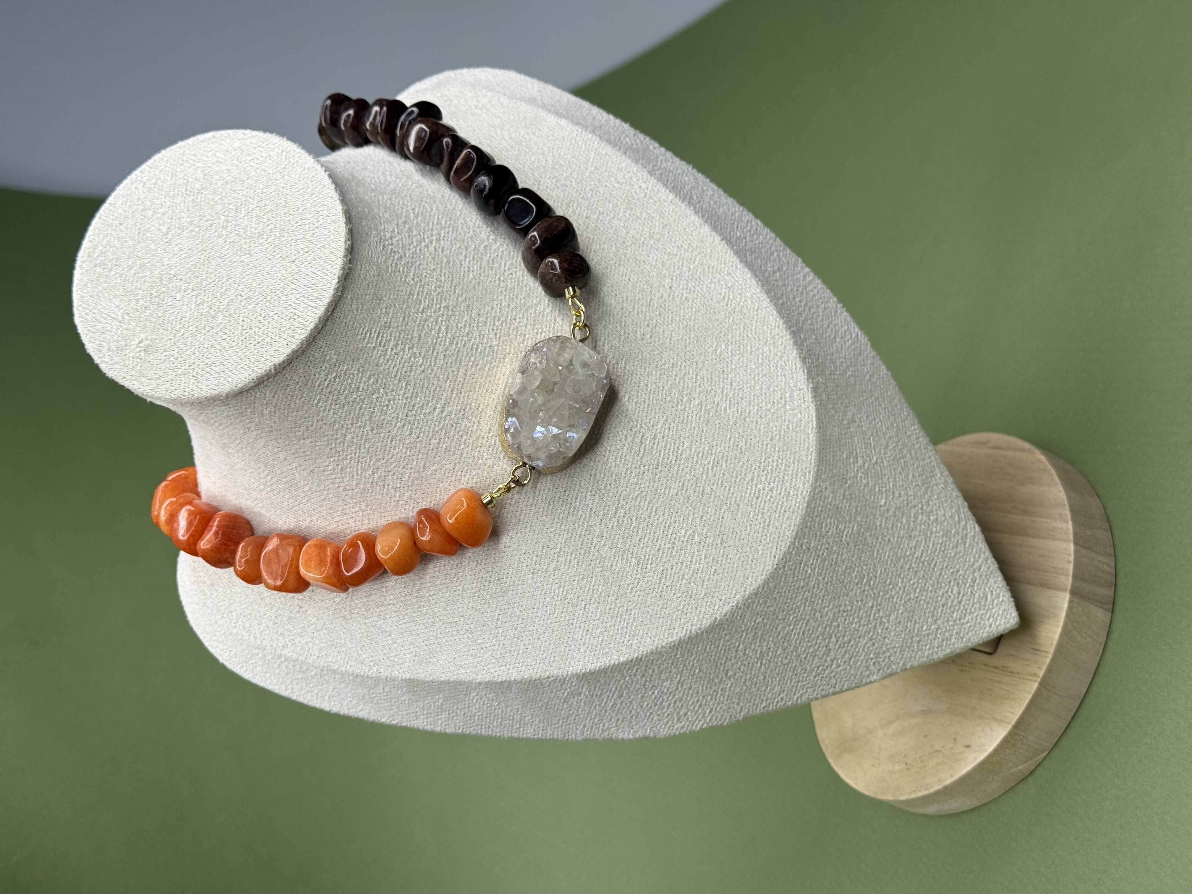 Колье AMBER DUALITY — украшение о балансе противоположностей и внутренней силе. Контрастный дуэт тёплого оникса и холодного сияния кварцевой друзы создаёт выразительную композицию, в которой сочетаются устойчивость и свет, земля и кристальная чистота.