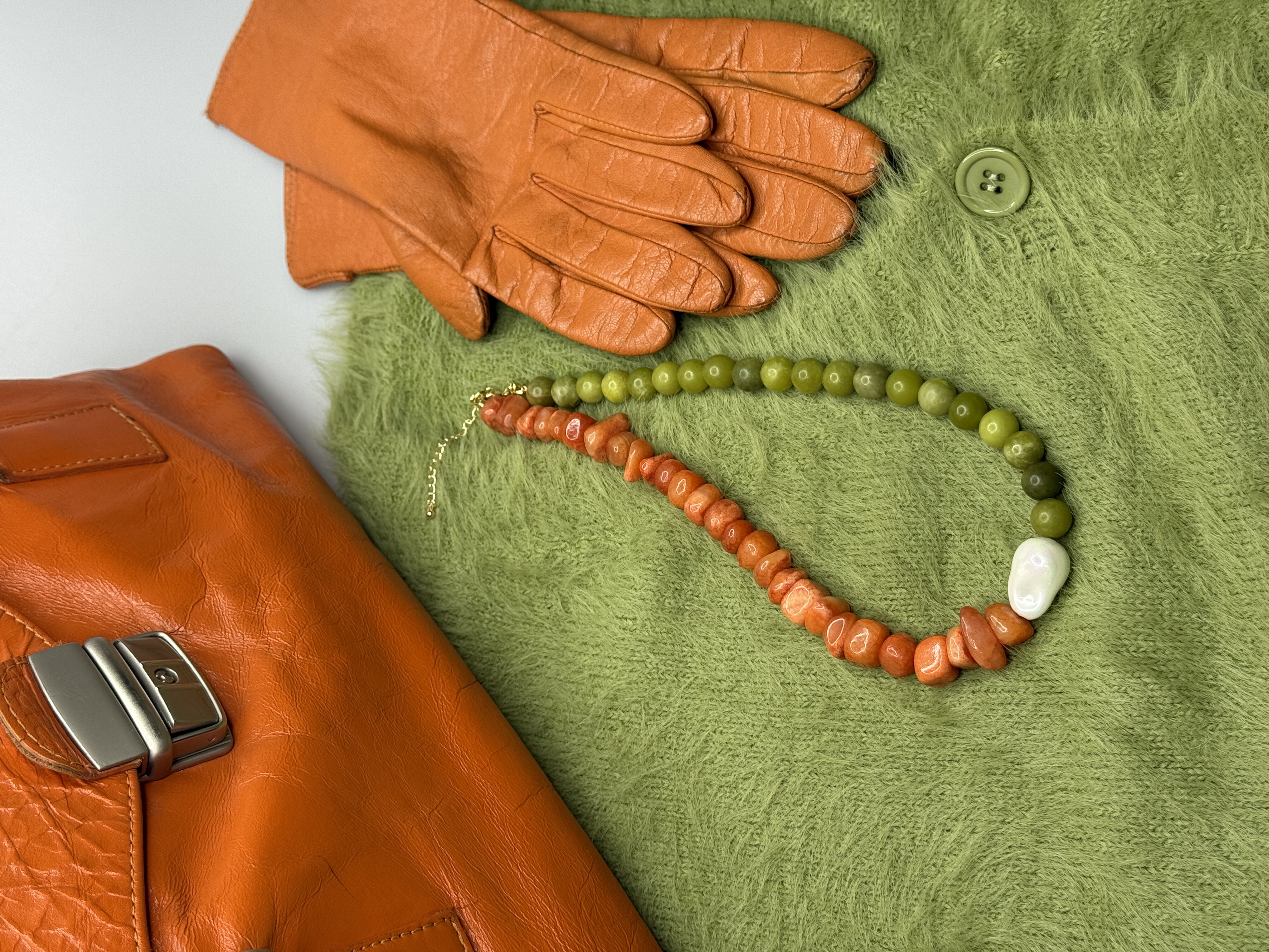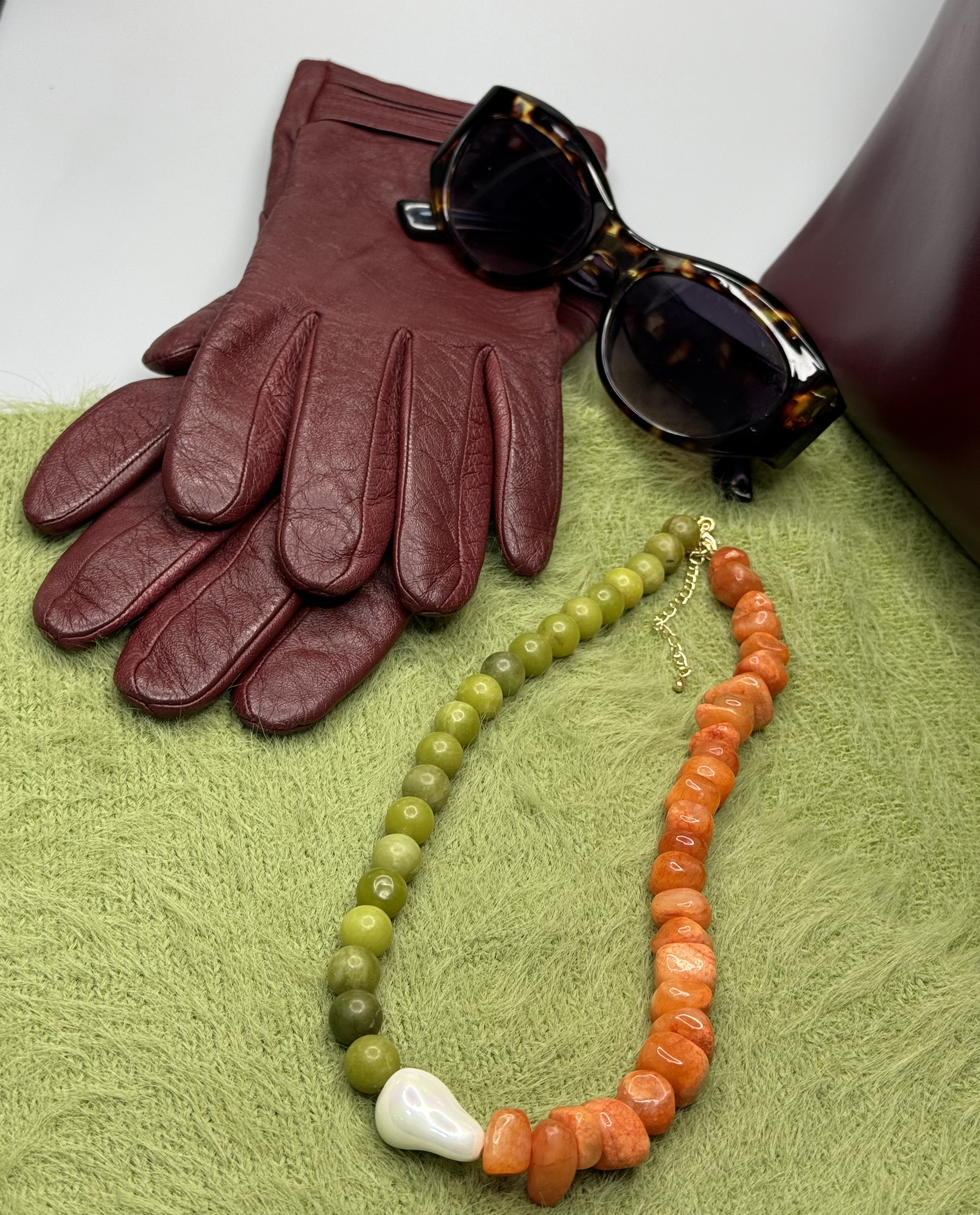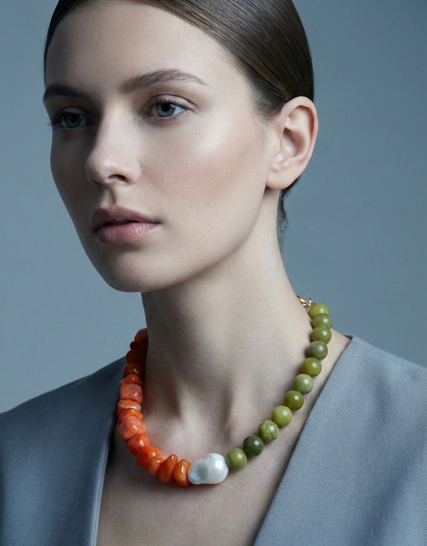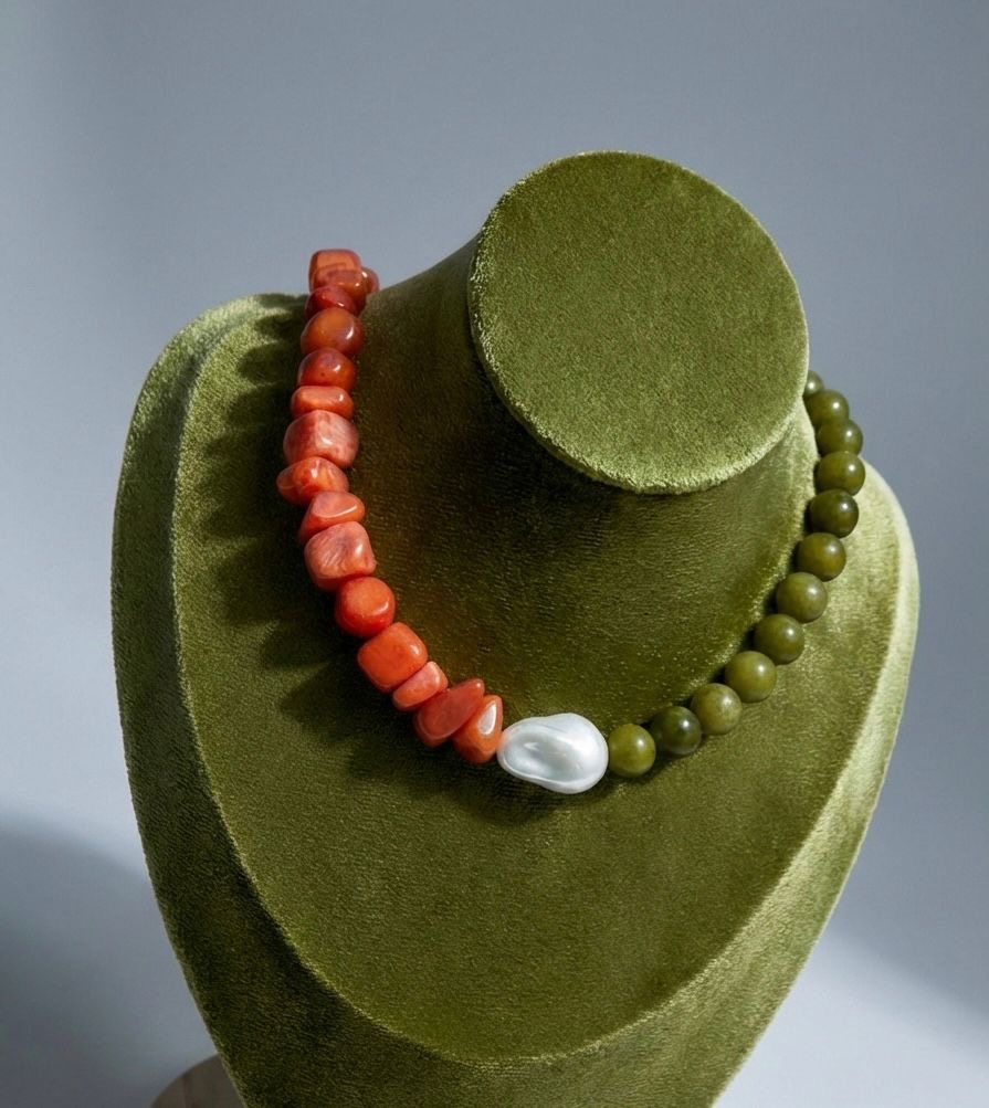 Жемчуг Майорка становится светлым центром колье, добавляя мягкость и утончённость, уравновешивая насыщенные оттенки камней. Украшение подчёркивает индивидуальность, не перетягивая внимание, и органично дополняет как повседневные, так и более собранные образы.
