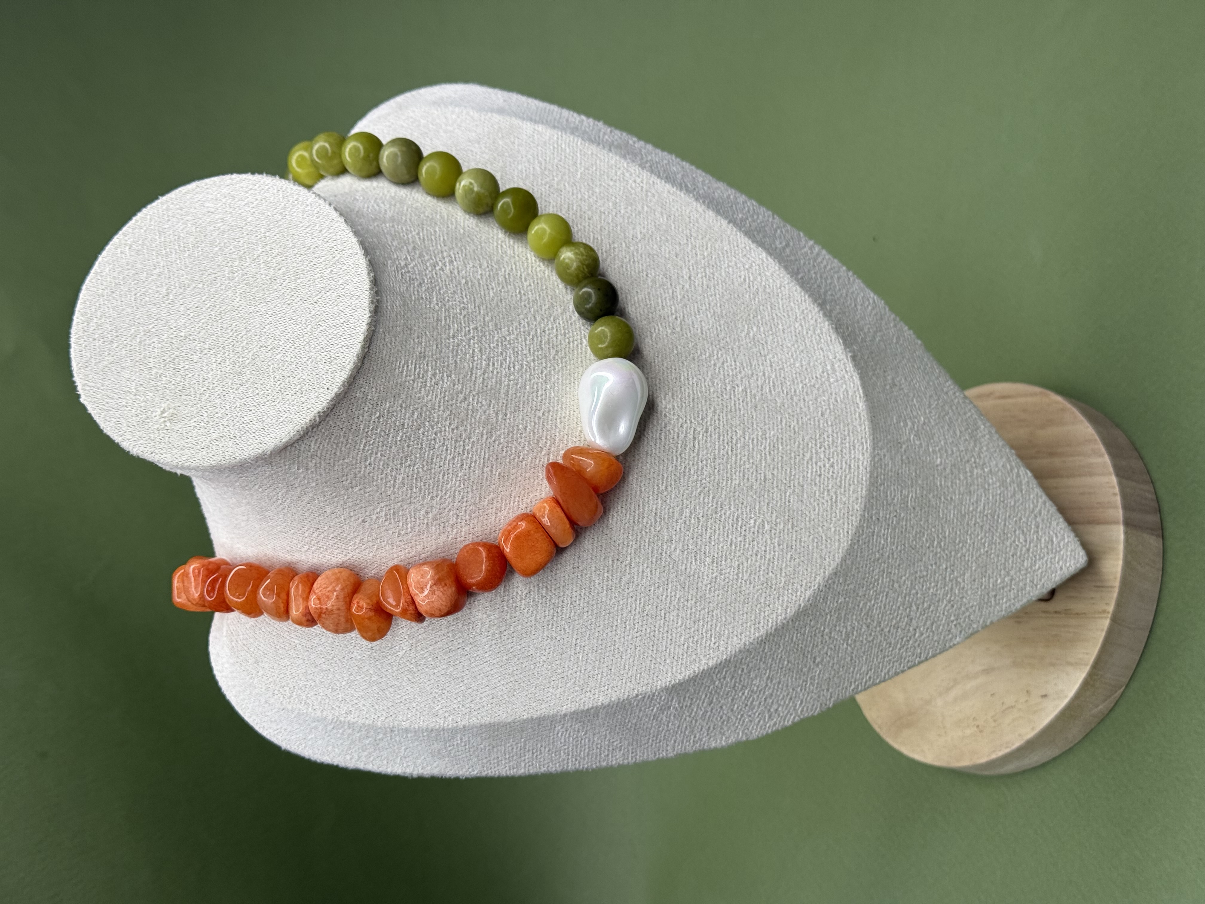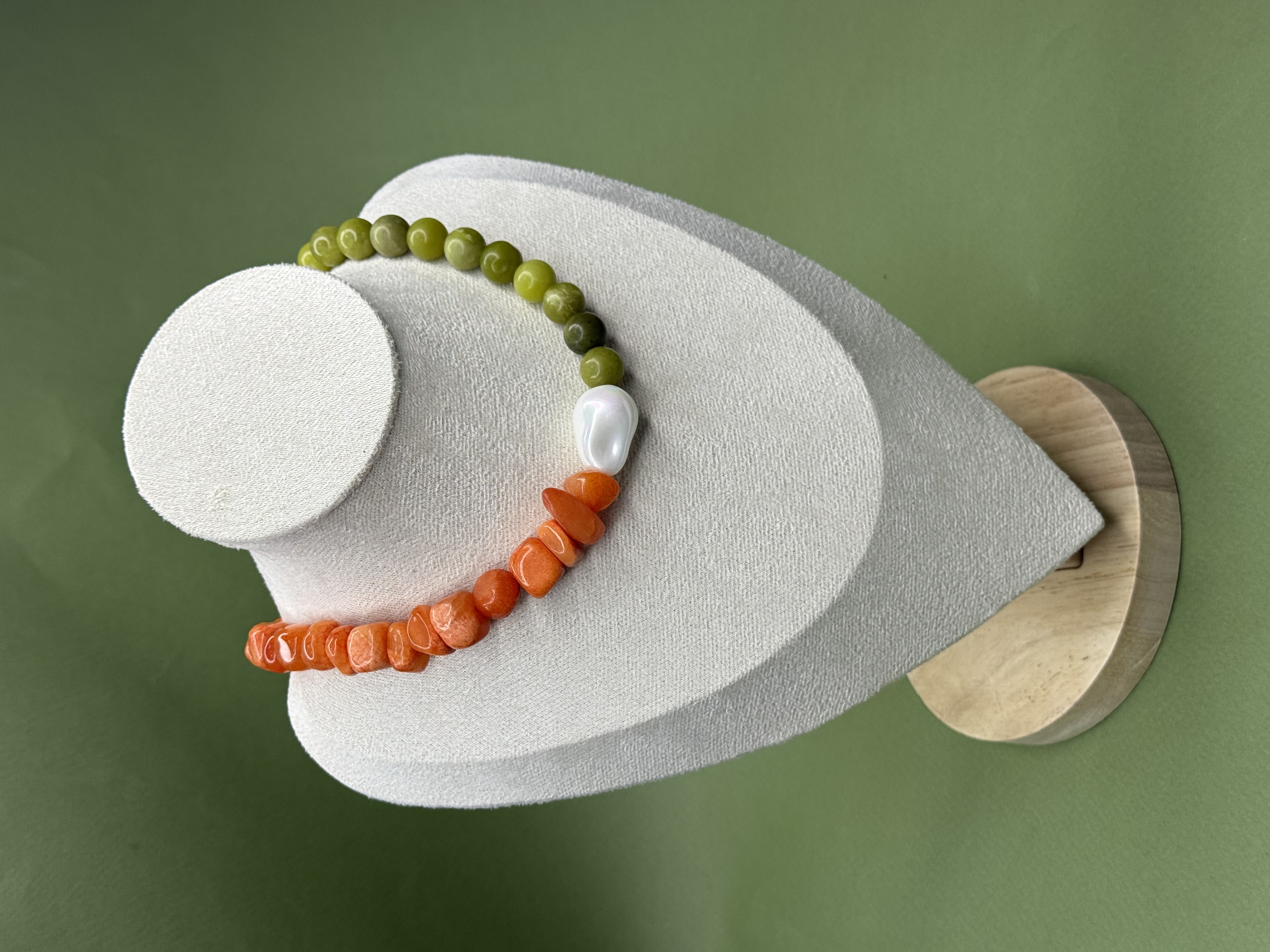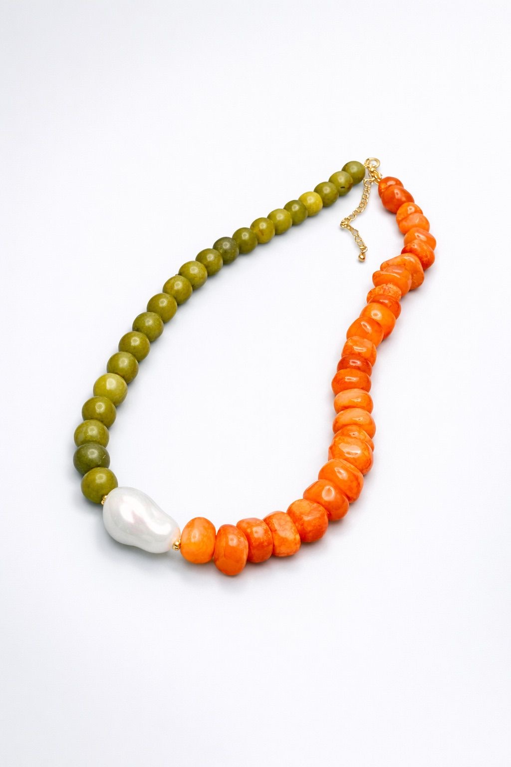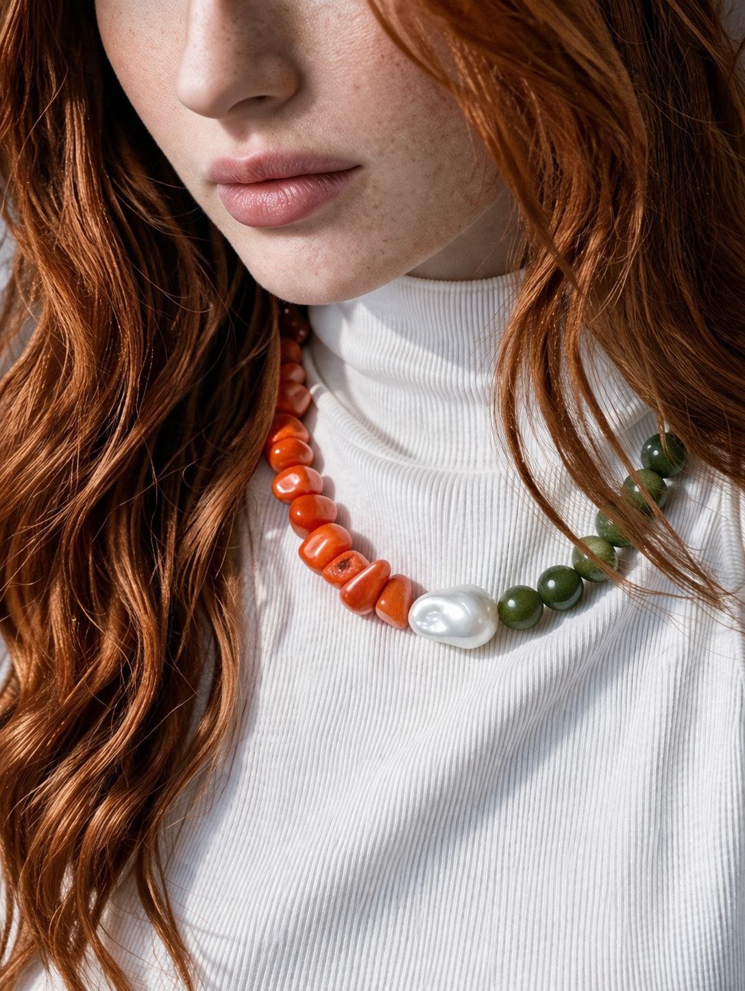 Жемчуг Майорка становится светлым центром колье, добавляя мягкость и утончённость, уравновешивая насыщенные оттенки камней. Украшение подчёркивает индивидуальность, не перетягивая внимание, и органично дополняет как повседневные, так и более собранные образы.