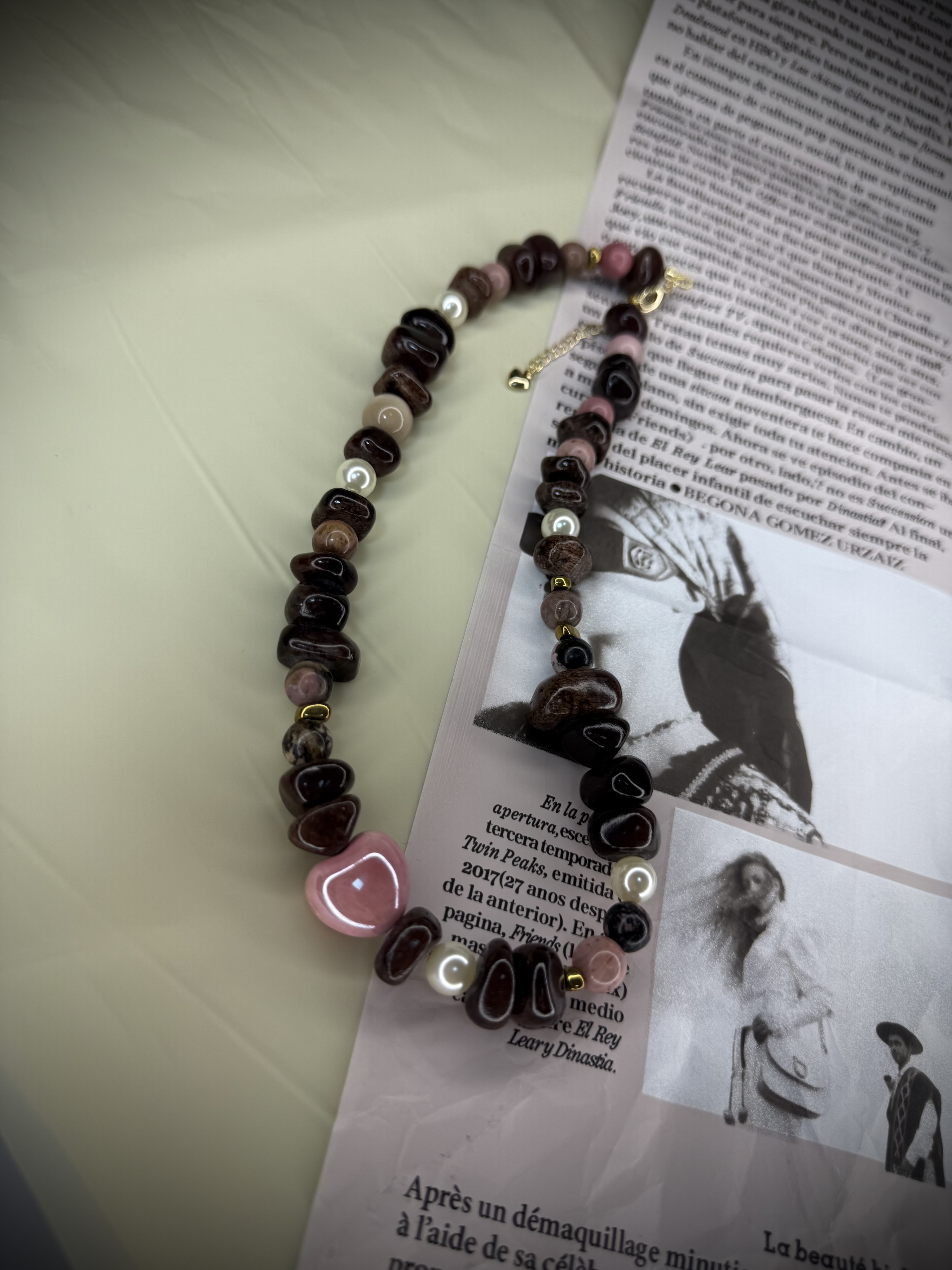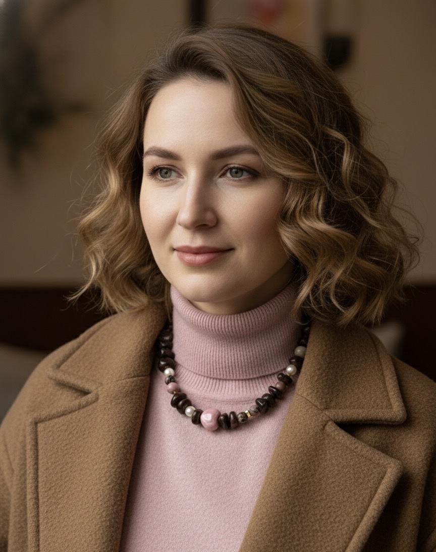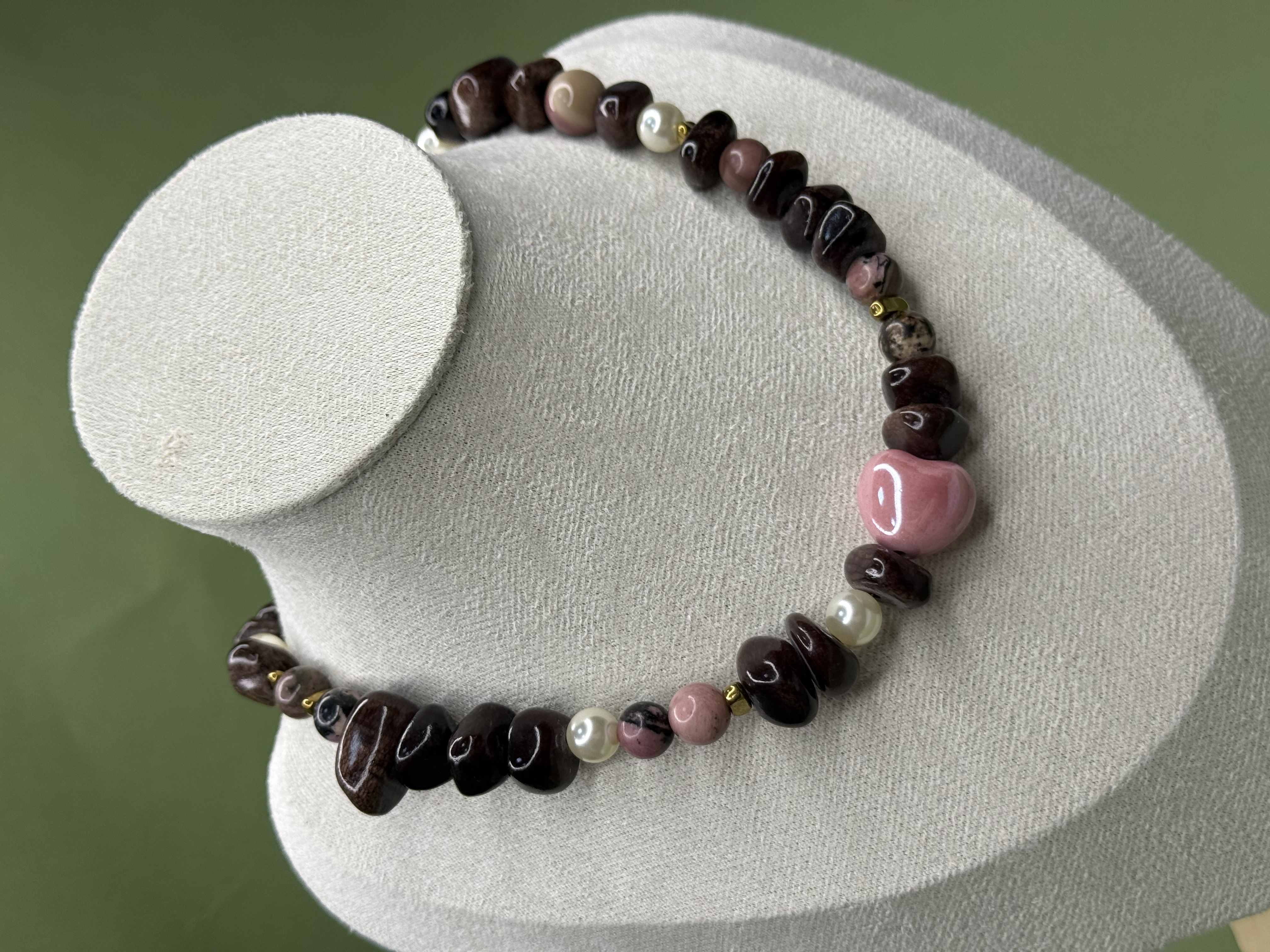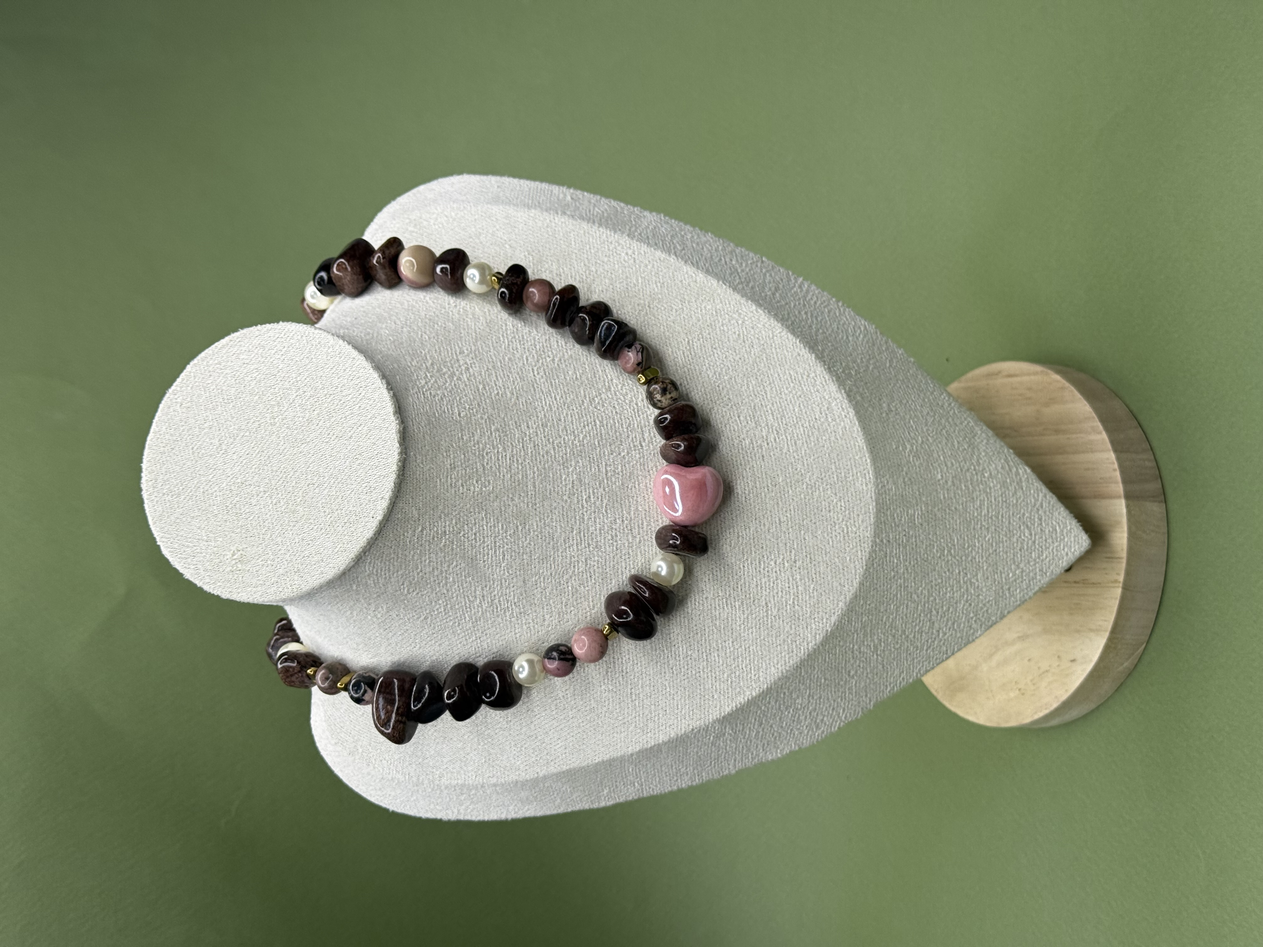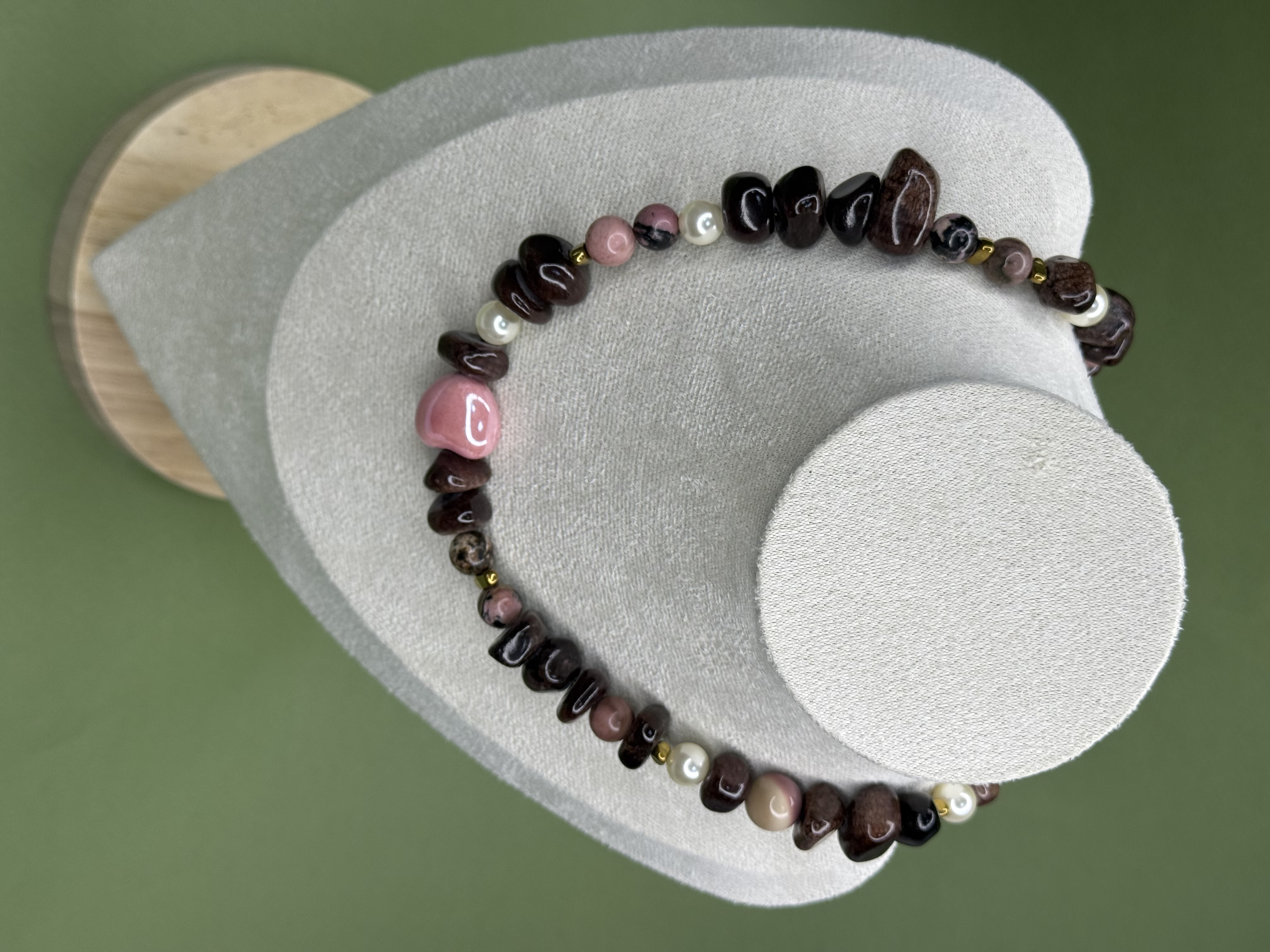 Гладкий оникс создаёт ощущение внутренней собранности и уверенности, родонит добавляет мягкий розовый акцент — тёплый, живой, чувственный. Жемчуг Майорка наполняет композицию светом и благородным сиянием, а золотистый гематит расставляет изящные акценты, подчёркивая статус и завершённость формы.